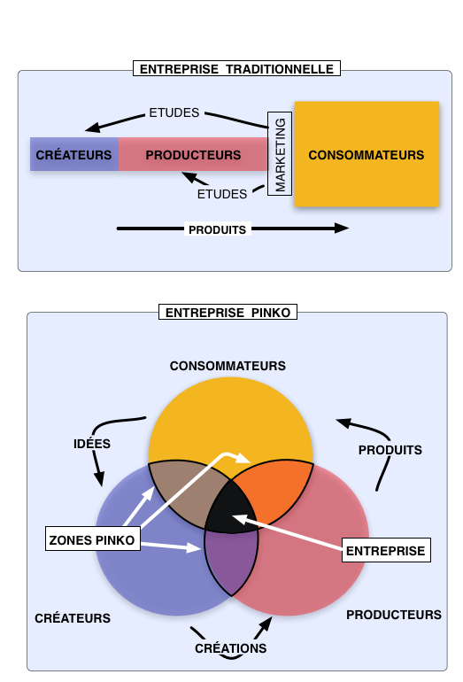 Une démarche Pinko va donc être très vite confrontée à deux problèmes. L'un sera simple à résoudre, il s'agit de la mise en relation, il faudra faire parler des membres de l'entreprise avec le monde extérieur. Le second le sera sans doute moins, il s'agit du retour offert, de la "rémunération" des efforts consentis par le monde extérieur. Il y a là sans doute pas mal de choses à inventer...